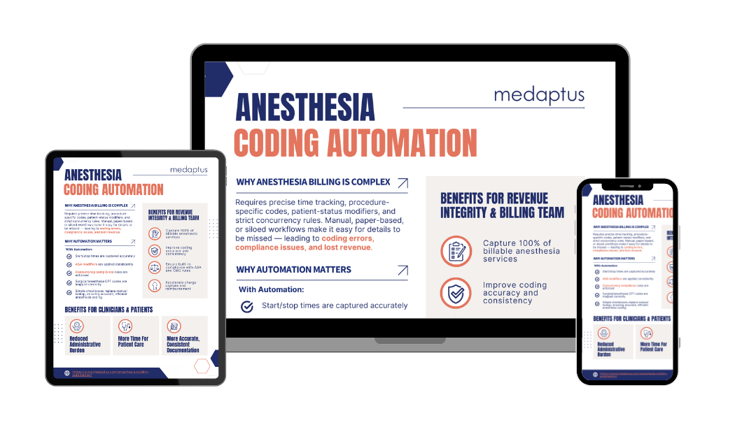 Anesthesia billing is uniquely complex, requiring precise time tracking, strict modifier usage, and adherence to payer-specific and concurrency rules. Manual or paper-based workflows often leave room for missed details, increasing the risk of coding errors, compliance issues, and lost revenue.